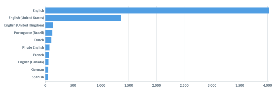 As you can see, English is the prevailing market by a considerable margin. The English locales give some information on the projects' country of origin. The United States is in second place and the United Kingdom in third place.